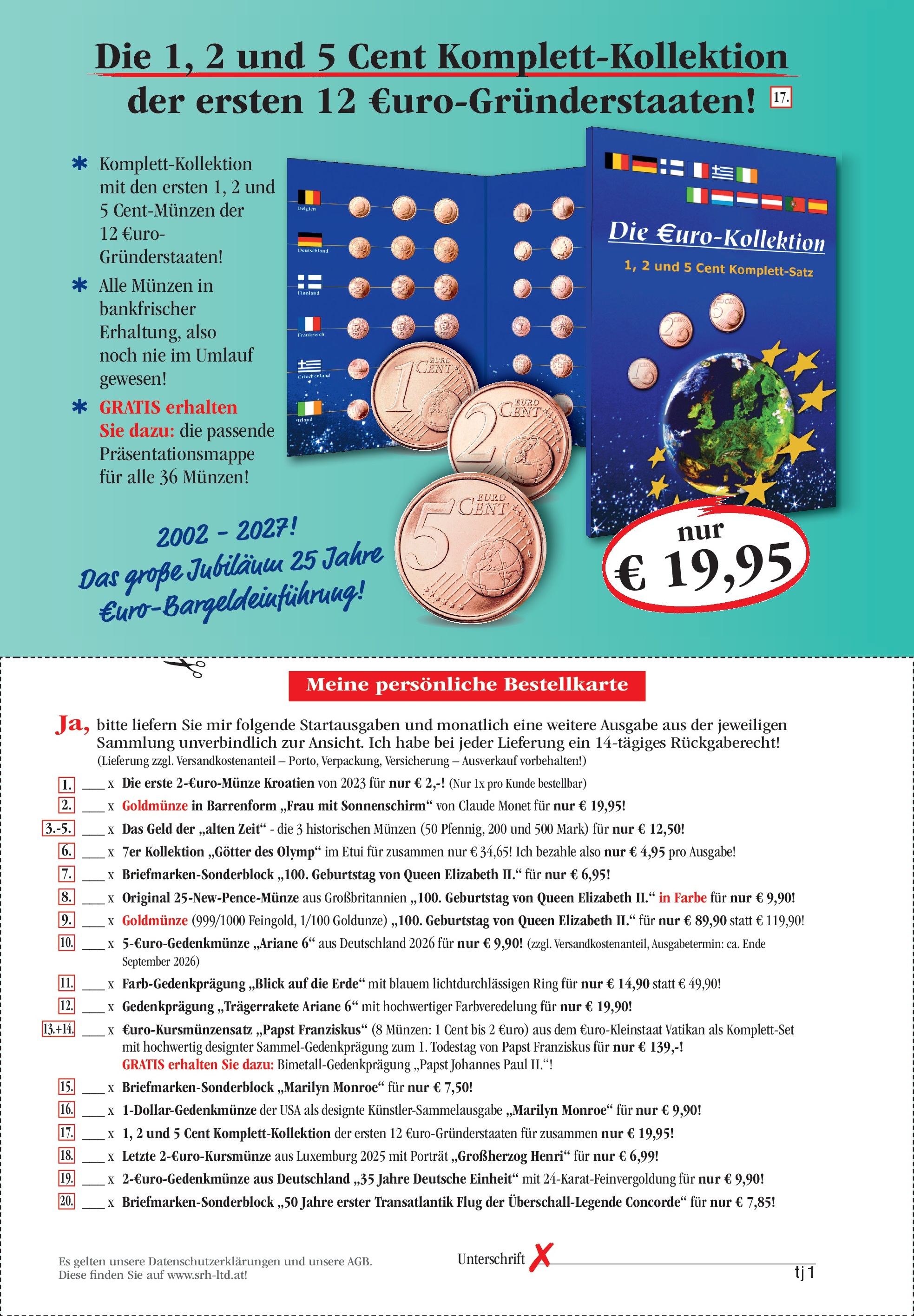 Vertrauens-Garantie/Widerrufsrecht: Ohne Angaben von Gründen können Sie Ihren Auftrag innerhalb von 14 Tagen widerrufen. Eine kurze Nachricht oder Rücksendung der Ware an SRH genügt. Sie tragen die unmittelbaren Kosten für die Rücksendung an Sir Rowland Hill Ltd. GmbH & Co. KG, Versandservice über Gebr. Weiss GmbH, Terminalstr. 91, 4600 Wels. Es gelten unsere AGB, die Sie unter www.srh-ltd.at einsehen oder schriftlich bei uns anfordern können. Datenschutz-Hinweis: Die Verwendung Ihrer personenbezogenen Daten für Werbung erfolgt vertraulich und nur von SRH. Der Widerruf ist jederzeit möglich: Per Post an SRH oder E-Mail an datenschutz@srh-ltd.at.